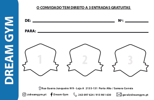 VOUCHER 14.90€ Surpreenda os seus amigos e familiares com o Voucher de Oferta do Dream Gym! Exclusivo para clientes, adquira o seu mensalmente e ofereça a alguém 3 entradas gratuitas para o nosso ginásio. Sem prazo de validade, é a forma ideal de partilhar saúde e bem-estar. Compre agora e promova um estilo de vida ativo! Pedir informações